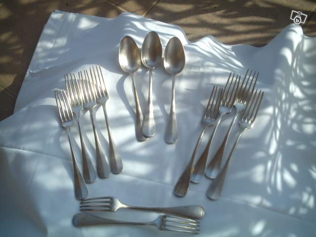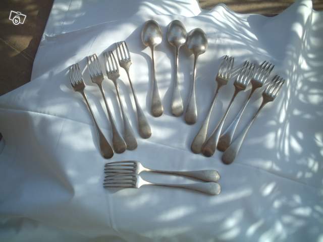 vend 10 fourchettes en métal argenté avec 2 poinçons dont 1 poinçon marqué métal blanc entre 69g et 74g et 2 cuillères avec 2 poinçons de 80g