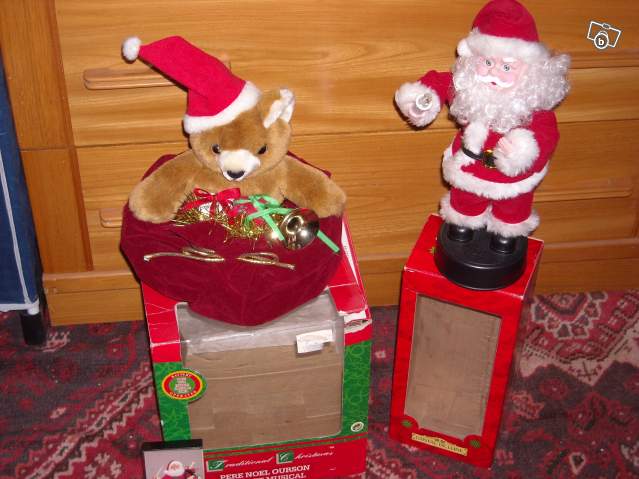Un père noël et un nounours "père noël" qui dansent et bougent en musique.Ils fonctionnent à pille. En très bon état. ils Peuvent aller sous le sapin ou sur un meuble...
