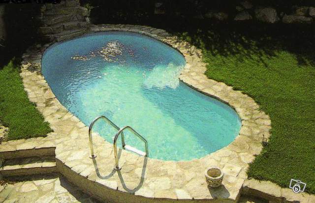 | piscine forme haricot 6,40 x 3,40 profondeur 1,25/1,65 avec local technique en PVC | ||||||