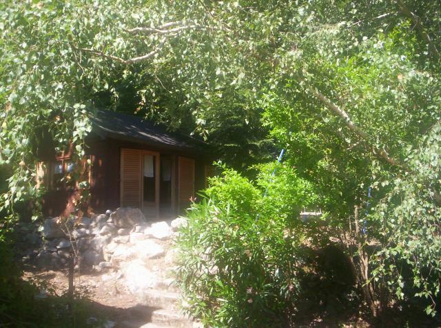 chalet à la montagne dans une foret de châtaigniers centenaires couchage pour 5 personnes kitchenette bloc sanitaire exterieur accés privatif à la rivière PRIX 550€ LA SEMAI